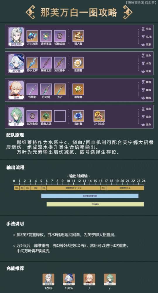 大家好,目前原神中最强主c那维莱特将在4.5版本下半卡池与万叶一起复刻。作为机制和强度都很高的角色,那维莱特的配队玩法是大家所关心的。本篇攻略主要分析那维莱特的主流配队组合“那芙万”,包括一图攻略,输出流程,充能,伤害等方面