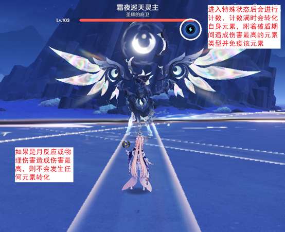 冰马战斗中会进入“晦隐”状态,全抗提升120%,受到50次攻击后解除此状态。攻击为任意元素,哪怕是物理也可以。同时,破盾期间造成最多伤害的元素会被其记录,冰马会免疫该元素伤害,同时永久附着该元素。例如火元素在破盾期间造成最多伤害,那么冰马就会免疫火伤,同时自身附着火元素。因此不要使用后续需要输出的元素来破盾。