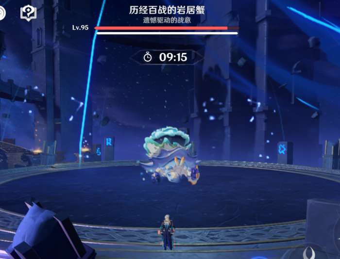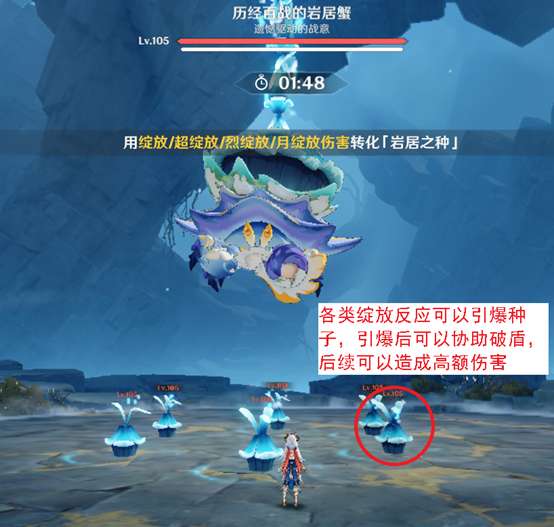 水螃蟹的机制非常简单,就是其在入场后会立刻飞天,同时在场上生成6个岩居之种,这个种子在受到任何一类绽放攻击,原绽放、妮绽放、超绽放、烈绽放之后就会对水螃蟹进行追踪爆炸,削弱其护盾。水螃蟹的护盾用6个转化后的岩居之种就可以击破,使其坠地,坠地后其会短暂瘫痪,之后就会持续在地面上产出岩居之种,此时我们可以用同样用绽放反应来引爆这些岩居之种,其会对水螃蟹进行攻击。
