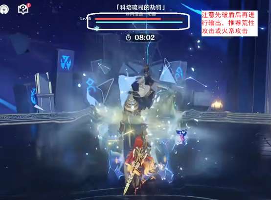 战斗中男舞者会开启冰盾,用荒性攻击,如夏沃蕾,可以直接破除,也可以用火系破除。因此各种超载队伍(含班尼特、夏沃蕾)在这一间特别好用。