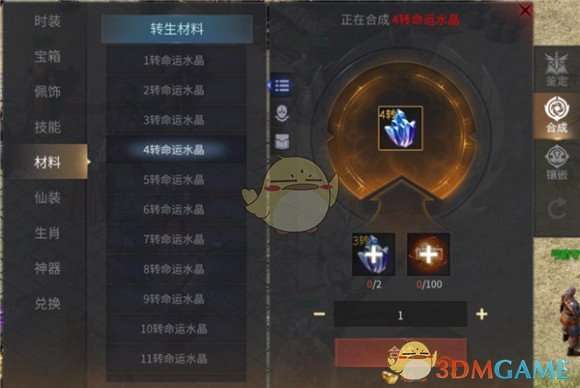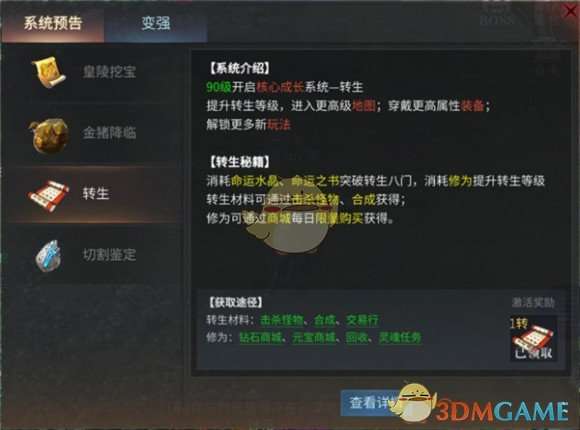 (2)90阶段当我们通过练功房或者打怪升到90级时将会正式开启我们的转生系统,转生需要消耗转生材料,分别为命运水晶与命运之书。