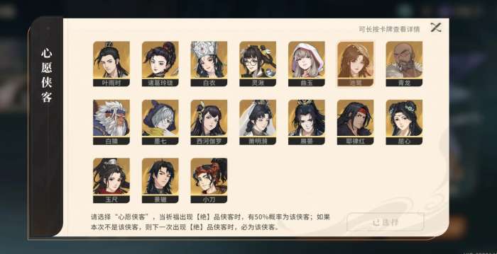 对决剑之川目前有三种不同类型的卡池。其中新手池是此作各新入坑伙伴的福利卡池,不仅十连抽所需的抽卡道具打了八折,可让各位用八个抽卡道具就能进行一次十连,还有着30抽必定能获得绝品角色的保底设计。但要注意该池子仅能抽30次,且所出的绝品角色只会从曲玉、白衣、屈心和诸葛玲珑中产生。完成30次的入坑福利抽卡后,新手池也将永久关闭,往后各位也没办法再进行抽取。当然,要是各位一直不抽它,它会一直存在不消失。