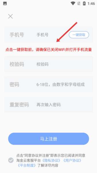 3、注册界面,用户需输入手机号、验证码和密码,底部有相关协议的勾选框,方便用户快速完成注册。