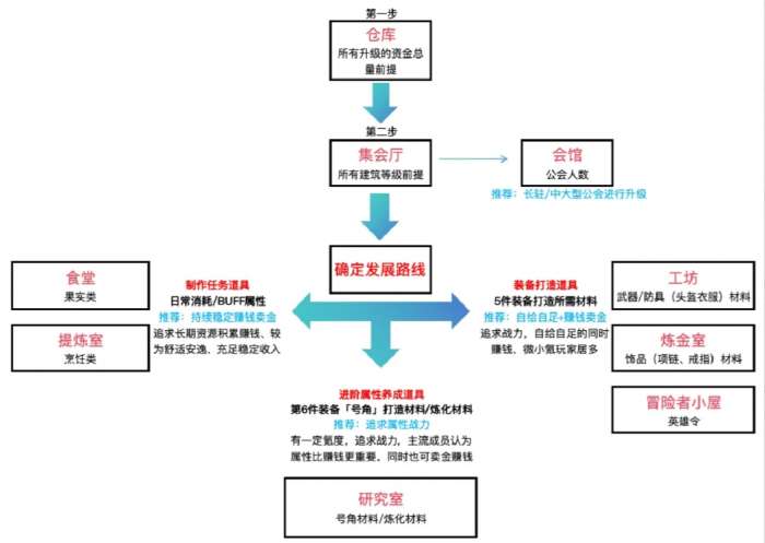 第一步:要升级任何建筑,先升金库,金库有容量了,才能存下更多的公会资金来升级其他建筑。