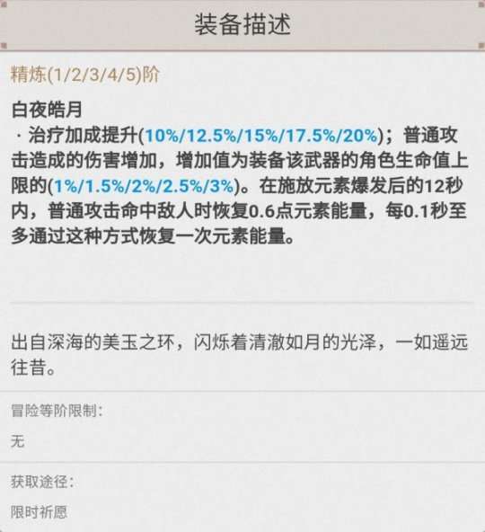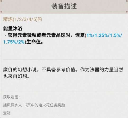 这个法器是所有法器中唯一可以增加治疗效果的,也是五星法器中除了碧落之珑以外唯一具有回能力的法器。但是需要在释放元素爆发后进行站场普攻,能够在一定程度上同时实现治疗效果和能量充能。