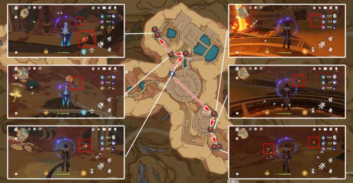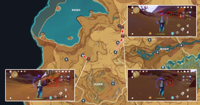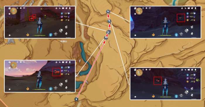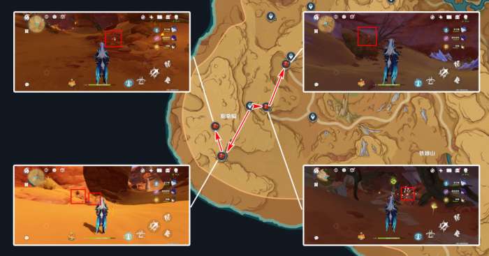 ◆铁穆山南侧传送点出发,左下采集点位于镀金旅团营地附近,剩余三处在下图三处位置山脚。