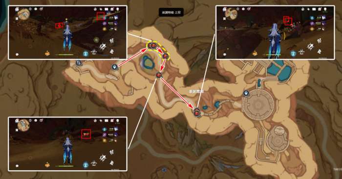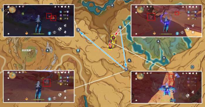 ◆荼泥黑渊左侧锚点出发,左上两处采集点位于向上走的崖壁小路上,左下位于山崖尽头正下方,右上位于巨大的地下坑洞右侧。