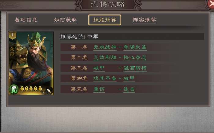 单体增伤技能,梯度T0。本作中最高的单体增伤技能,虽然会限制自身无法释放普通技能,但超高的增伤使得关二爷成为本作中兵刃追击的天花板级将领