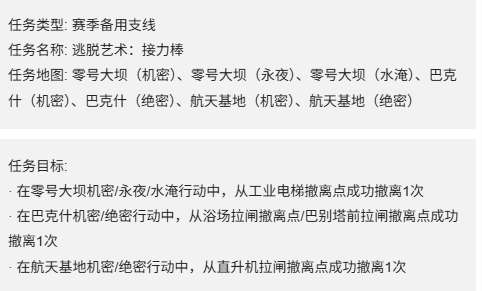 软件提交 专题合集 热门手游在《三角洲行动》S7赛季的“逃脱艺术:接力棒”任务中,玩家需分别在零号大坝、巴克什及航天基地的指定拉闸撤离点各成功撤离一次。下文是三角洲行动S7逃脱艺术接力棒任务攻略。