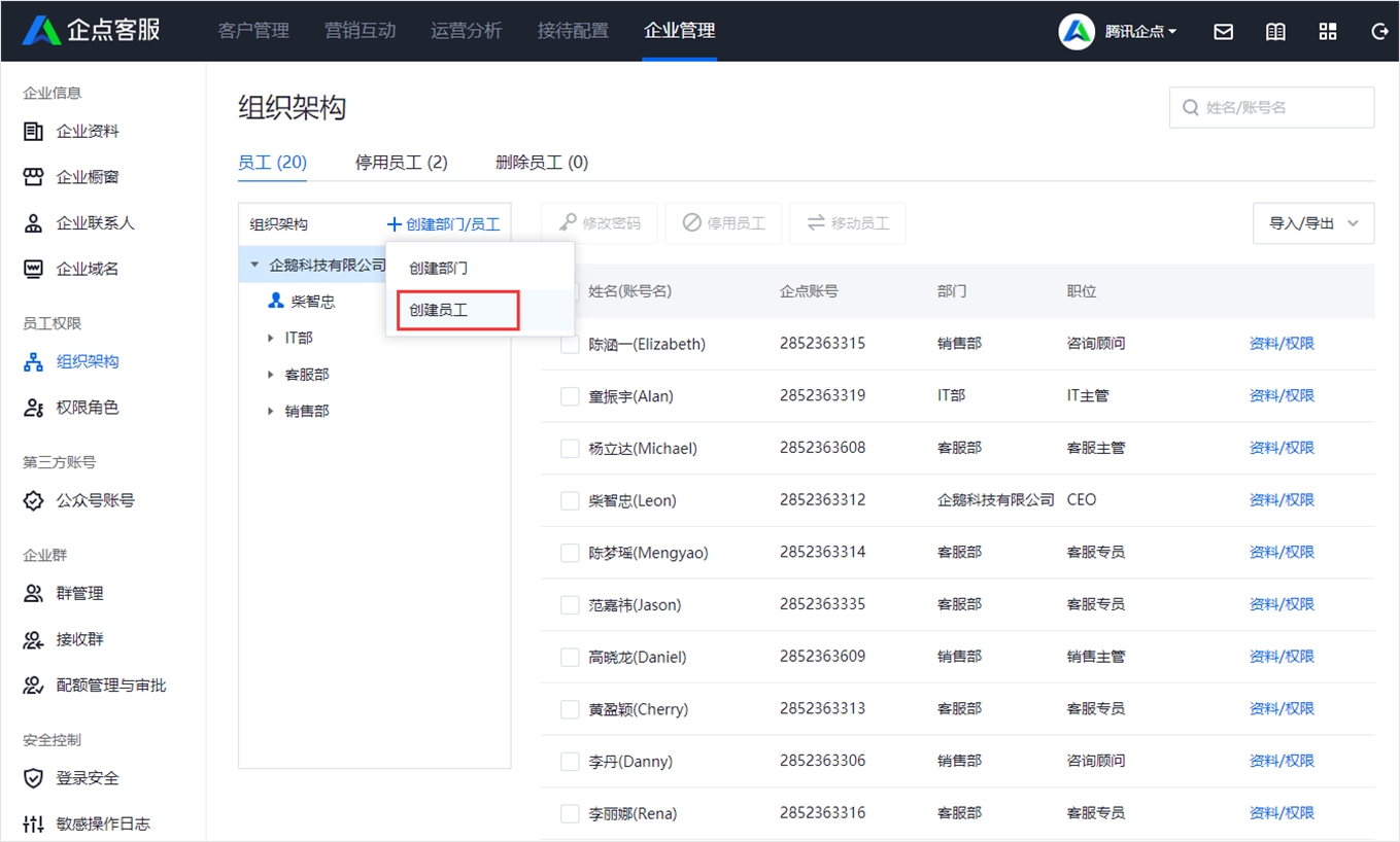 1、打开腾讯企点,点击“创建员工”按钮,在这里填写员工资料。