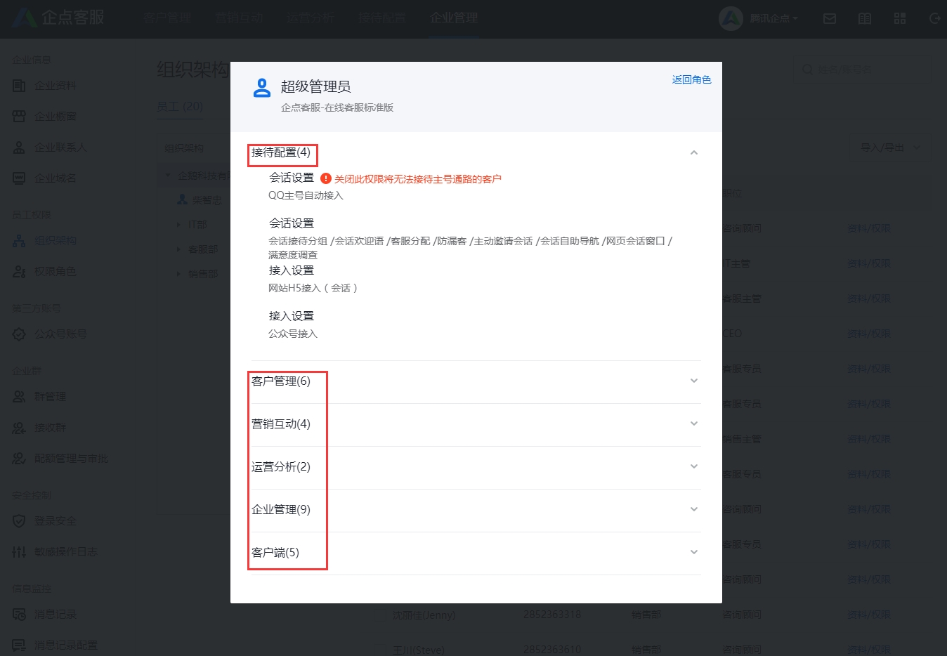 3、可为员工配置管理权限,可以直接选择现有角色模板(如默认的“超级管理员”角色),也可以自行创建角色,设置权限中每个大模块均可下拉勾选小模块的细分权限。