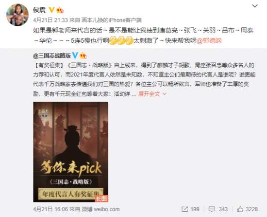 这次代言合作可算是由侯震牵线,《三国志·战略版》官方诚意相邀。
