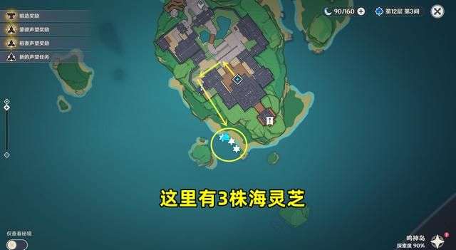 2、第二个点位,在神里屋敷东南方的岛礁上。传送到神里屋敷,转身向东南方走,到悬崖边直接飞下去就可以看到一座小岛礁上有几个丘丘人,旁边有5株海灵芝。