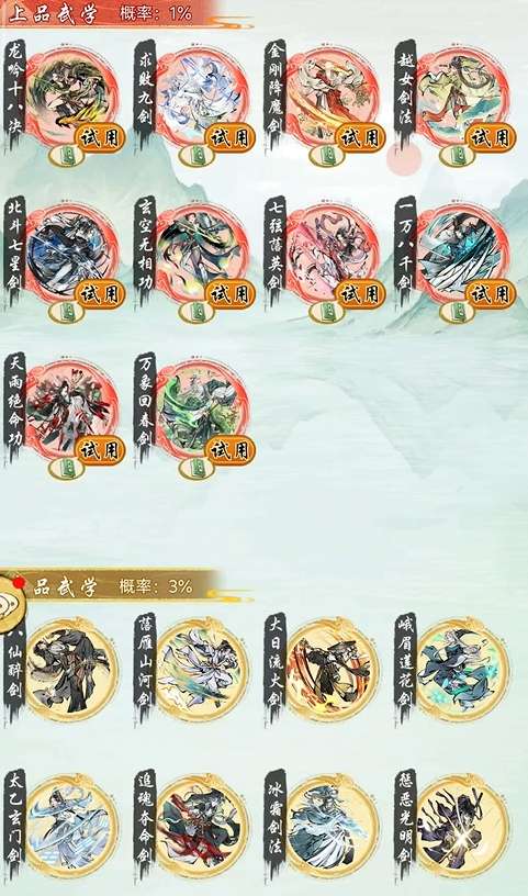 华夏千秋里的三种武学品质为上品、中品和下品,上品武学为红色,是游戏里品质最高的武学,中品武学为金色,强度只排在上品武学之后,而下品武学则为紫色,是游戏里品质最低的武学。同时,品质也代表着各武学稀有度,品质越高的武学获取难度越大,而中品和下品武学的获取难度相对来说要低一些。每种武学都由外功(攻击招式、防御招式)和内功组成,其中攻击招式有击刺斩劈绝五个不同行为的招式,防御招式则为拨引接化发,内功则有十种。