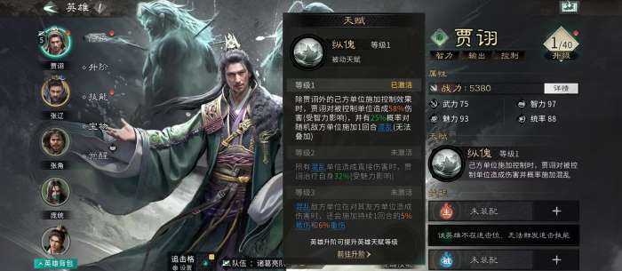 贾诩的基础属性以智力为核心,初始值与成长率均处于全武将梯队前列,确保其在中后期持续输出能力。真正决定其战略价值的是天赋效果:每当敌方或我方其他单位对目标施加控制状态(如眩晕、挑衅、技穷等),贾诩立即对该目标发动一次智力伤害,并有概率使一名随机敌方单位陷入混乱。混乱状态下,单位行动目标完全随机,可能攻击友军;更关键的是,所有混乱单位受到直接伤害时,贾诩可恢复自身生命;若混乱单位误伤己方,则目标将额外承受一回合易伤与重伤效果——这使得混乱不仅是干扰手段,更是持续压制与资源转化的关键支点。