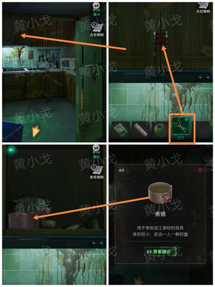 19.点击橱柜,用【剪刀】剪断红绳;打开橱柜,获得【煮锅】(有小高能)