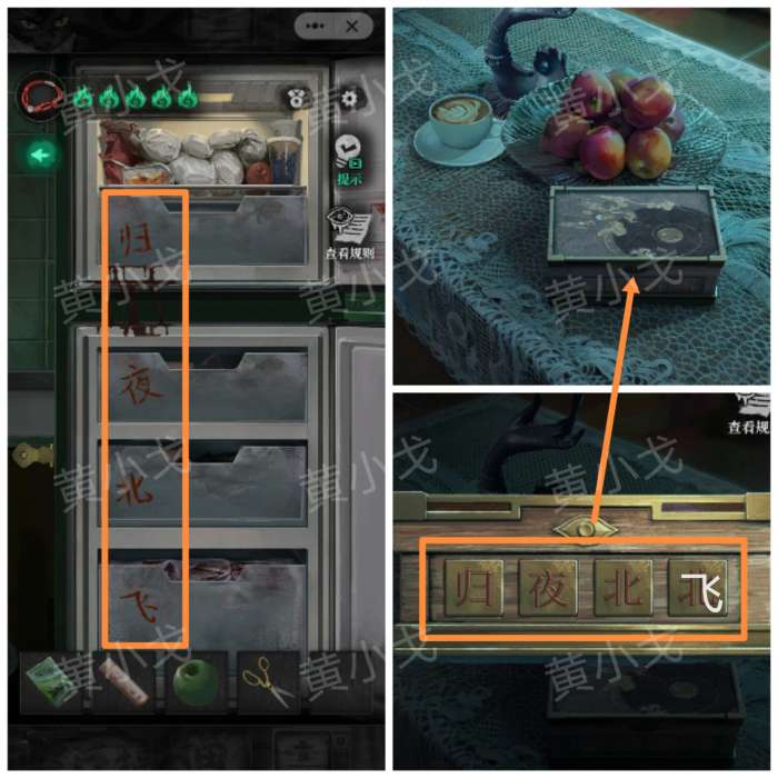 23.点击茶几上的盒子,根据[厨房]场景冰箱里的文字线索,输入密码:归夜北飞