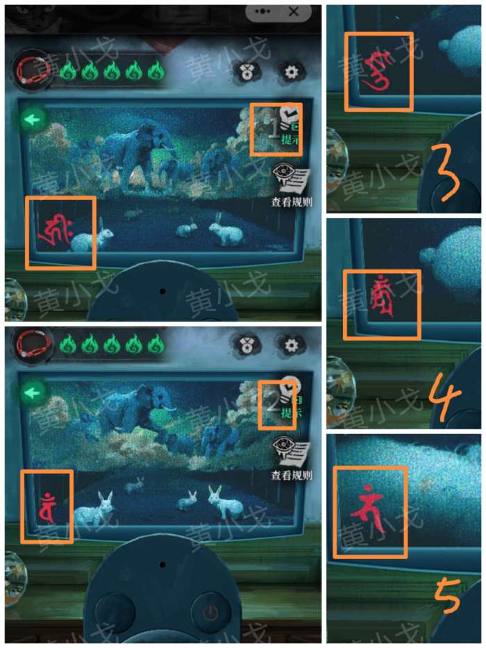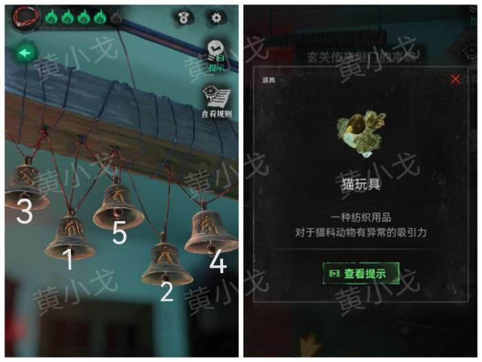 29.点击吊钟,根据[客厅-左]场景电视画面中出现的符号的顺序点击有对应符号的铃铛,获得【猫玩具】