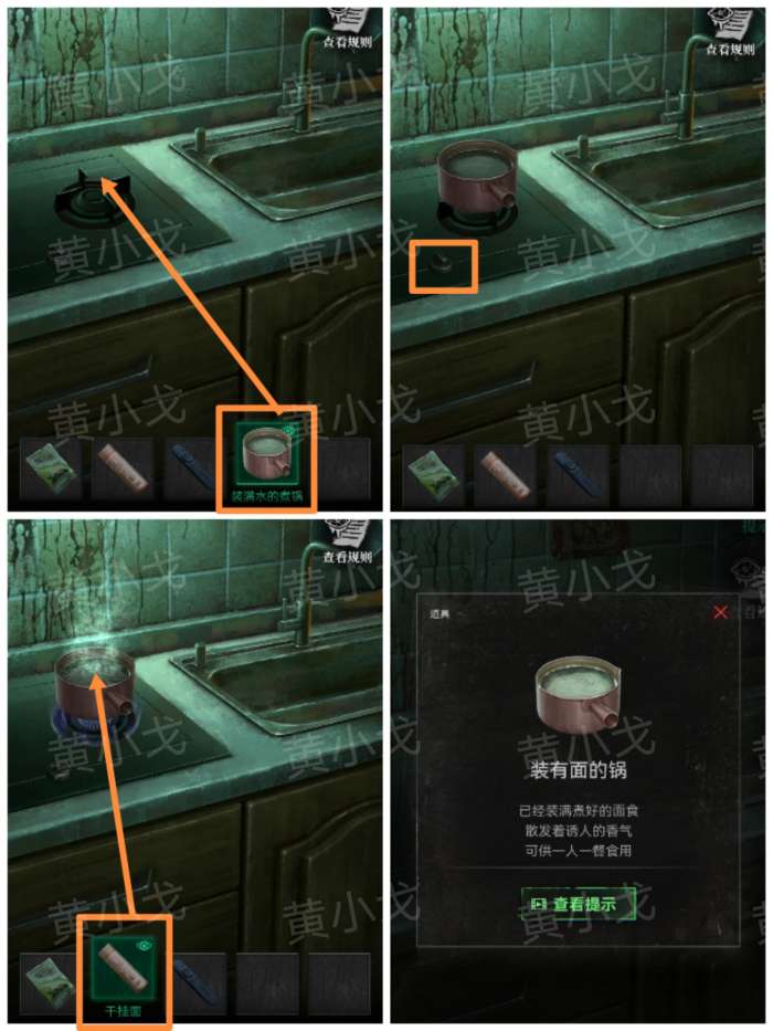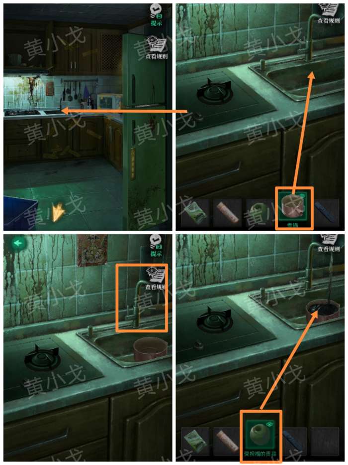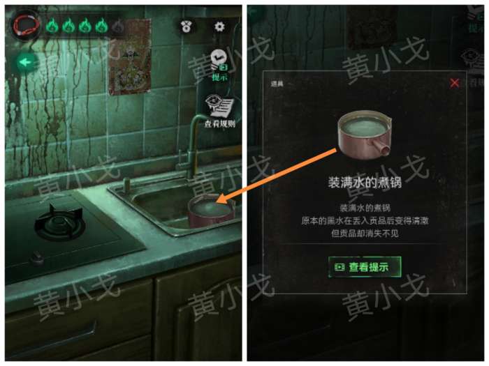 20.把【煮锅】放入洗菜池中,打开水龙头,装满黑水,把【守祝福的贡品】放入锅中