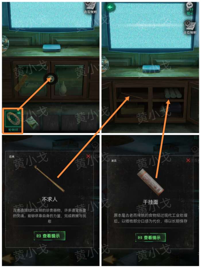 4.把【轮转环】嵌入电视柜凹槽中;打开电视柜,获得【不求人】和【干挂面】