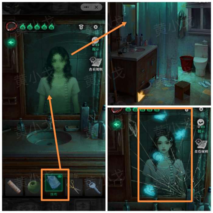 14.点击洗水池,用【抹布】擦掉镜子上的污渍,获得图案线索