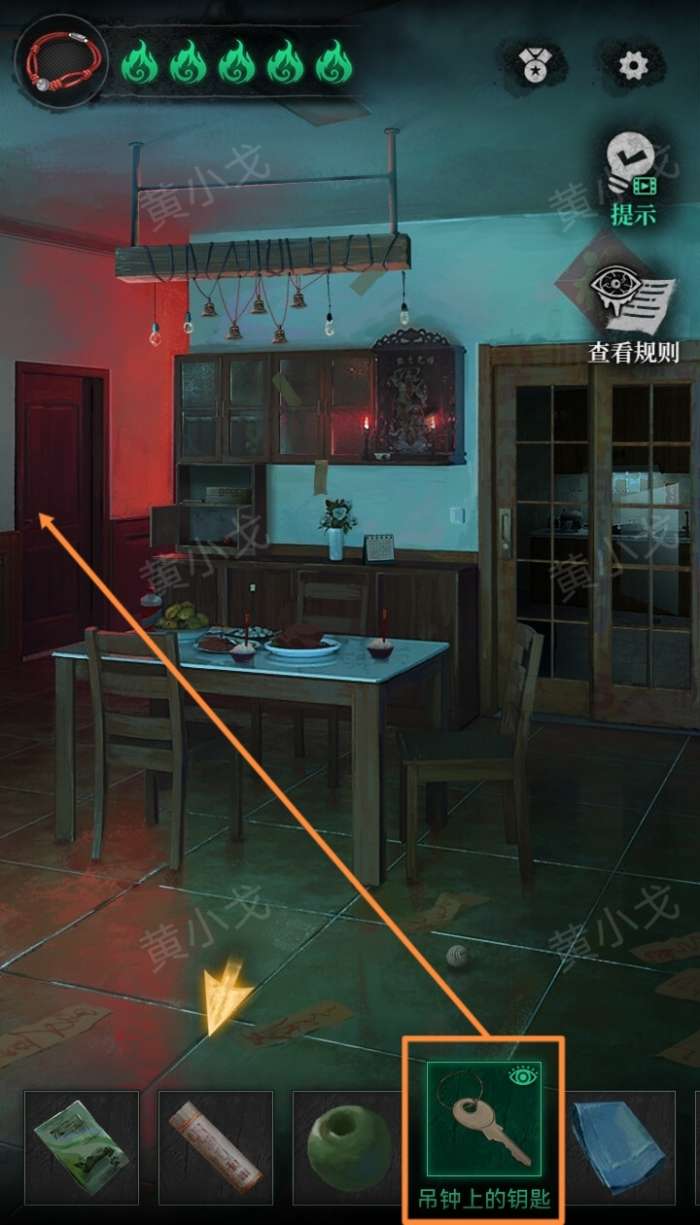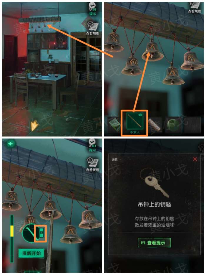 7.点击挂着的吊钟,使用【不求人】;完成小游戏(2次),获得【吊钟上的钥匙】
