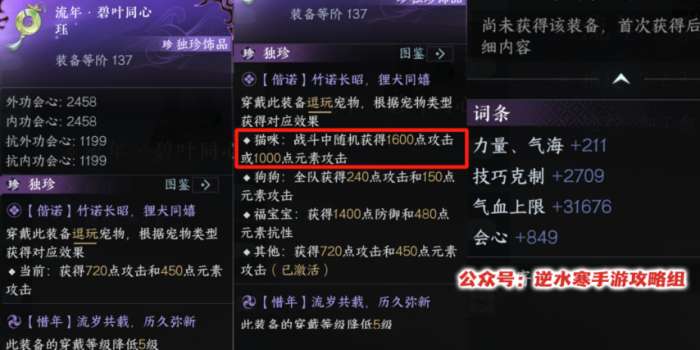 (2)流年·碧叶同心多独珍说明:开荒团本必带手镯,可用来替代天后·海晏定澜珠。穿戴装备后,选中自己的宠物逗弄可切换不同属性(根据宠物类型),猫咪/狗狗/福宝宝属性如下所示,选择其他类型(如凤凰)激活其他,当前阶段PVE推荐逗玩猫咪。