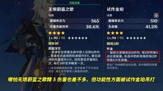 评价:对于那维莱特而言,它的伤害强度与试作金珀差不多,但在功能性方面会略有不足。试作金珀在使用大招后能够回复18点能量,在大招循环上大大强于无垠蔚蓝之歌,而且还能为全队恢复18%的生命值。