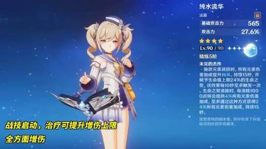 评价:预计仅次于流浪乐章、黑岩绯玉和纯水流华。流浪乐章和黑岩绯玉都具有55.1%的暴击伤害加成,而且武器特性的上限非常高,可以达到超越5星的水平。纯水流华可能对一些玩家来说比较陌生,它是枫丹铸造武器,它的战斗技能启动需要增加治疗量以提高全体伤害。不仅局限于普攻和重击,元素爆发也能吃到增益。