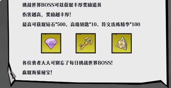 挑战世界BOSS可以获取丰厚奖励道具伤害越高,奖励越丰厚!