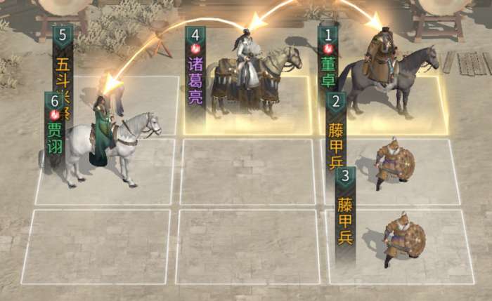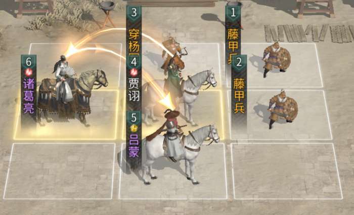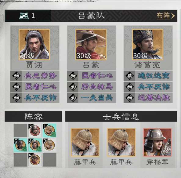 前排携带2个藤甲兵吸收伤害,中间布置1个穿杨军补充伤害。队伍依靠吕蒙和诸葛亮的控制效果触发贾诩的天赋追伤,造成大量伤害。对比携带董卓的贾诩控制队,整体的坦度更高,队伍成本更低。