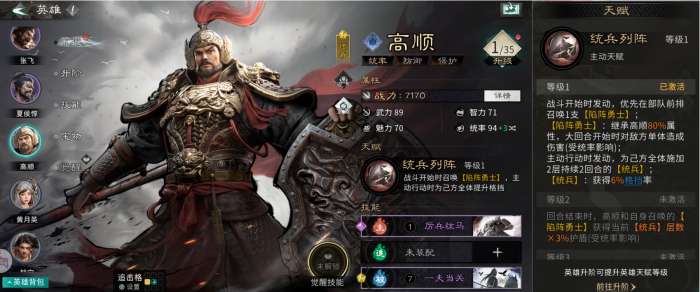 等级一:战斗开始时在部队前排召唤一支【陷阵勇士】(继承高顺80%属性,大回合开始时对敌军单体造成伤害);主动释放时为己方全体增加格挡率。
