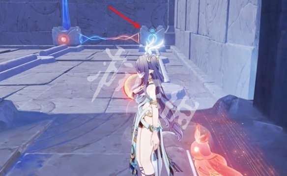 4、看向右前方的镜子,将镜子中箭头指向的物体吸引过来,以推动雕像。