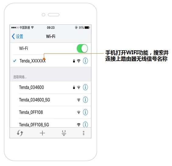 使用手机连接路由器底部贴纸上标明的无线网络,如下图所示: