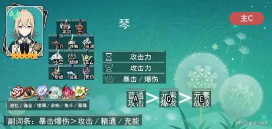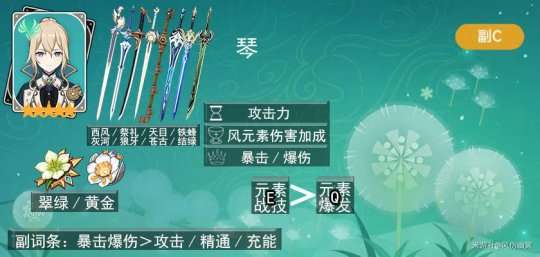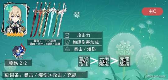 琴是「五星风系单手剑全能型」角色,具有多种玩法,可以扮演输出、治疗、辅助和快速攻击角色。她的大招可以消除自身所持有元素带来的【debuff】,有助于应对繁重的战斗环境。此外,她还是唯一可以对【摔伤】状态进行攻击的角色。