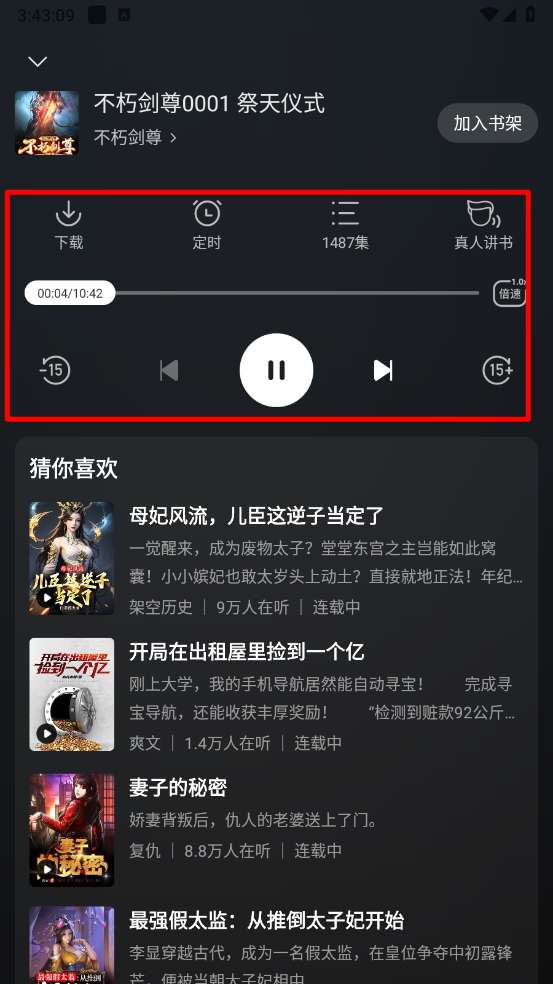 5、如图,即可开启听书体验,支持下载、定时、倍数听书哟。