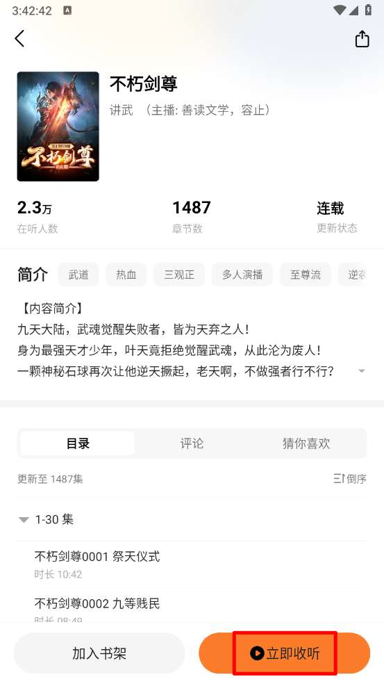 4、打开进入小说详情页,点击"立即收听"。