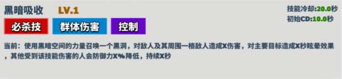 描述: 召唤一个黑洞,对敌人及其周围一格敌人造成X伤害,主要目标受到X秒眩晕效果,其他受到伤害的敌人防御力降低。