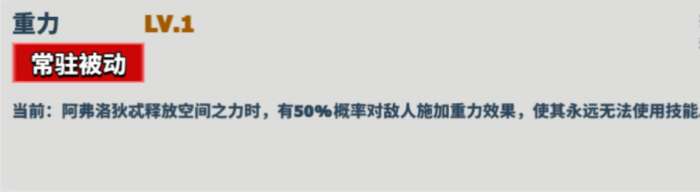 描述: 释放空间之力时,有50%概率对敌人施加重力效果,使其无法使用技能。