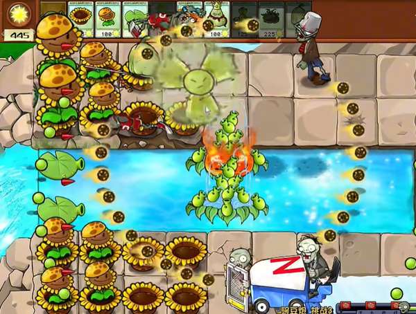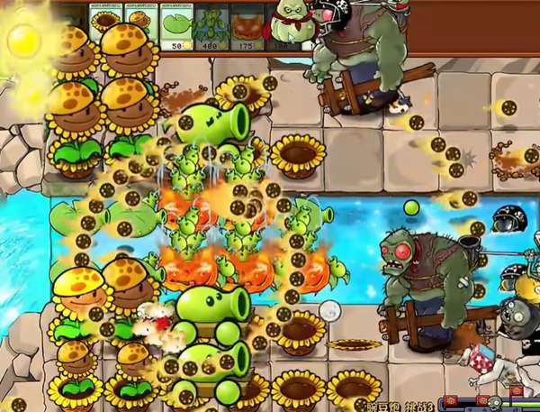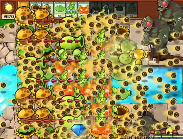 3、阳光向日葵的数量足够之后,我们就去建造一个豌豆喷泉和火南瓜的组合,同时也可以开始放置我们的豌豆大炮。