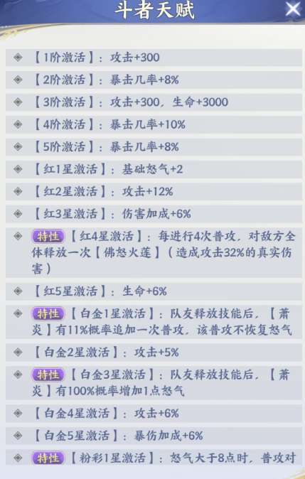 比如他在后期激活了自身的天赋能力之后,每次普攻之后还可以释放一次佛怒火莲的机制,这个机制也可以让他带来更多的真实伤害效果,同时在降低对面防御数值的情况下,他的特性同样也是可以对敌人产生一定破防的效果,所以对于一些需要物理穿透效果的角色来说,萧炎他绝对是非常适合大家操作的角色,那么在前期通过他的特性激活了这类效果的话,可以造成的真实伤害百分比也达到了32%的数值,而在后期萧炎的特性通过不同的星级进行提升的话,还可以带来更多的追加攻击,虽然施加的攻击是普攻,但是他的普攻在有怒气加成的情况下,同样也是很好用的。