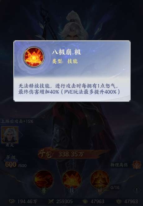有足够输出的战斗体验对于他来说很重要,萧炎进行攻击的时候,有这类加成伤害数值都可以增加40%,如果萧炎参与pve的话,那么这里的这个百分比最多的时候也是可以提升到400%的,那么角色在使用的情况下,大家关注萧炎这样的技能之后也要注意后期他的进阶强度,特别是天赋系统当中的效果,这个效果主要是让他在自身天赋能力上面开启足够的怒气积累,在有足够的怒气获取机会时,他才会有足够的伤害加成,而且在这里新手时期他也可以发挥出更有效的战力效果。