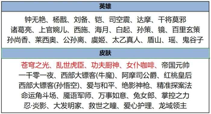 皮肤碎片商店,加入了项羽-苍穹之光、张飞-乱世虎臣、程咬金-功夫厨神、妲己-女仆咖啡等皮肤。