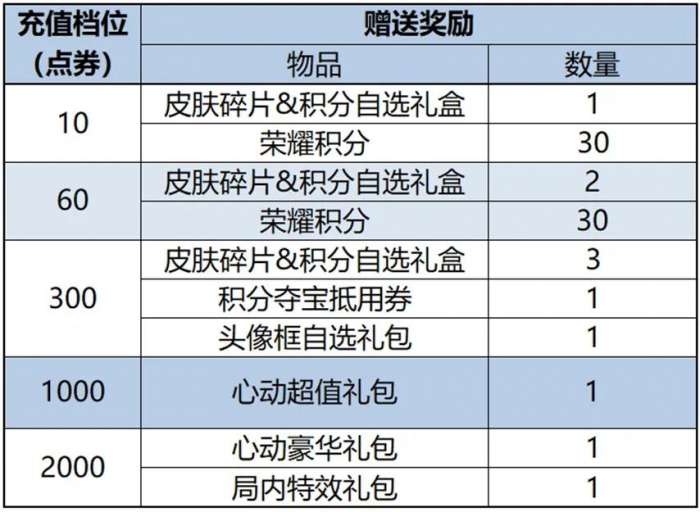 活动时间2月6日-2月8日,累计充值到指定档位可领取荣耀积分、积分自选礼盒和局内特效礼包等奖励。