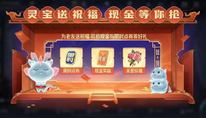 活动时间2月6日-2月19日,给老朋友发送英雄视频祝福,每日发送的灵宝群祝福红包被好友领完后,必得限时点券。
