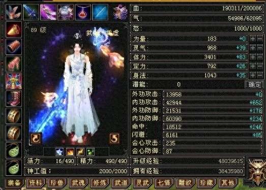 血量20万,蓝量6.2万,内功防御6万,命中1.8万,闪避6161,会心攻击235,会心防御87!