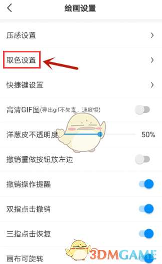 4、接着在“绘画设置”界面找到“取色设置”,点击它,进入到“取色设置”界面。
