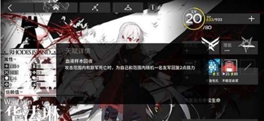 华法琳的特殊能力是“血液样本回收”,当她在非精英化状态下攻击范围内有敌军死亡时,会提升自己和攻击范围内某一干员1点技力。