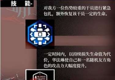 初始技能“紧急包扎”可以通过使用普通攻击积攒技力点,使用后可以对血量低于50%的单位进行治疗,治疗量为被治疗单位总血量的一定百分比。第二技能“不稳定血浆”会牺牲自己的生命值,大幅提高自己和攻击范围内一名干员的攻击力。