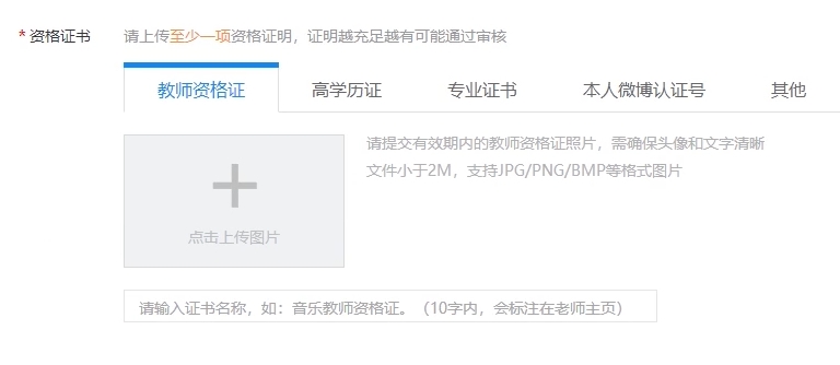 5、提交资料,注意这里需要上传教师资格证及其他证书,证书越充足越可能通过审核,填写完成之后点击提交资料,然后等待审核即可。